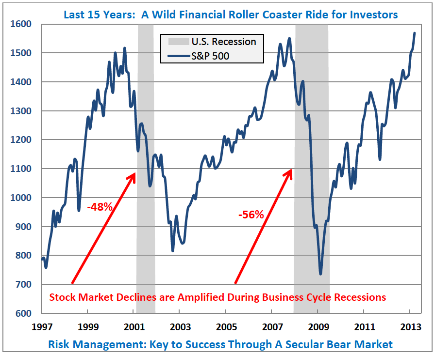 The first quarter ended on a happy note with the S&P 500 index finally reaching the two top high points set in both March 2000 and October 2007. It took the stock market 5 1/2 long years to regain the 56% drop suffered during the ‘Great Recession’ of 2008-2009. On the other hand, the typical Pring Turner client recovered and achieved new all-time portfolio highs in 2010 and subsequent new highs in every year since. The U.S. stock market currently sits near levels first reached almost fourteen years ago. It has certainly been a wild financial roller coaster ride for investors. Buy and hold has not been a winning strategy this century. Success has been best achieved by having a plan to both grow assets during the bull markets and a serious plan to protect portfolios during the ride down in bear markets. The core proactive investment strategy at Pring Turner is to carefully pay attention to business cycle swings (especially important during recessionary periods) to manufacture returns while reducing risk through the normal ebb and flow of the economic cycle.