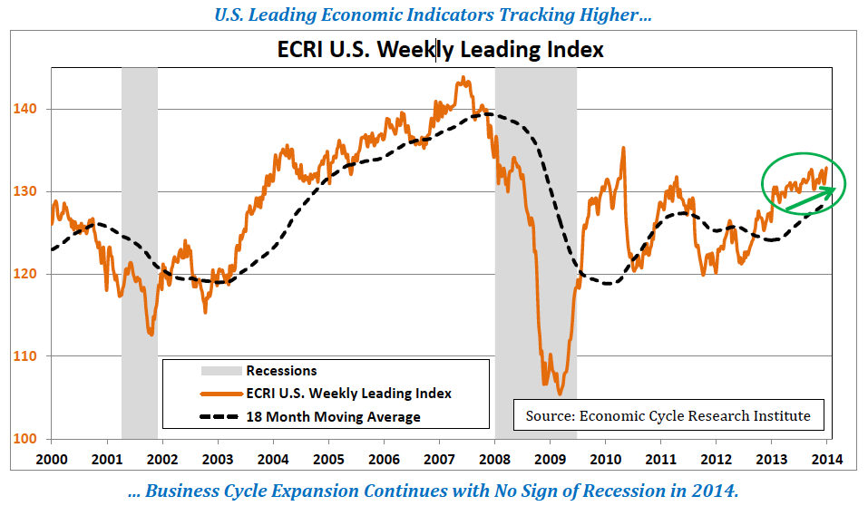Economy: This year begins quite a mirror image from last with investment professionals and individual investors alike feeling much more confident. Economic headlines are certainly more optimistic compared to the early days of last year. Employment is slowly recovering, budget deficits are shrinking, residential real estate prices are stronger and U.S. manufacturing is making a comeback. The end result of this improving news is consumer confidence has climbed to post-Great Recession highs. Adding to the list and most important from our business cycle perspective, is the fact leading economic indicators for the U.S. economy continue to track higher levels indicating there is no sign of recession in 2014.