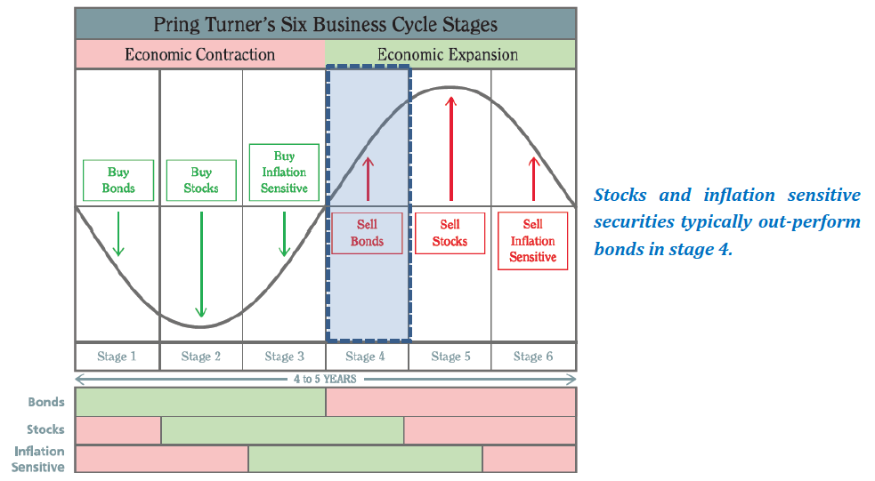 Bottom line the business cycle is progressing and picking up momentum that is supported by improving global economic activity. Our business cycle work continues to place us in Stage 4, an inflationary part of the cycle but price action in the financial markets has not totally reflected this so far. This phase of the cycle is characterized by four things—a growing economy, a rising stock market, a decline in bond prices and strength in industrial commodities. The current cycle has experienced the first three but so far industrial commodity prices have been range bound.