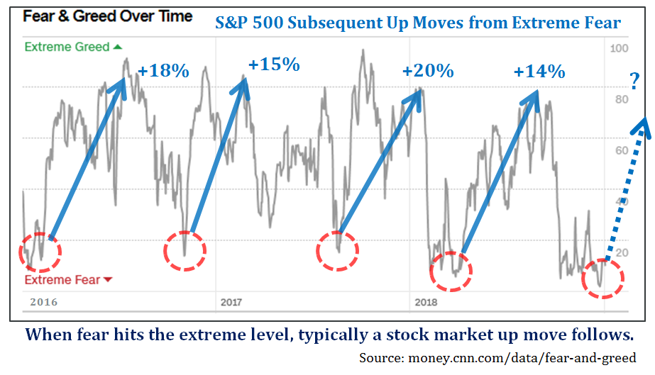 One reason why the stage is set for a great start to 2019 is there is extreme investor fear today. We have often stated that “the stock market is simply fear and greed superimposed over the business cycle.” During last month’s market-sinking spell, we issued a special bulletin in which we introduced CNN’s Fear and Greed Index. This index provides a proxy of investors’ emotions which cycle back and forth to both extreme. Remember, as investors, it is often more profitable if you turn your emotions upside/down. Our positive outlook is anchored by the fact favorable stock market returns have followed extreme “fear” levels such as we have experienced lately. Simply put: as investor emotions rebound from extreme “fear” levels, the pendulum generally swings back with better stock market returns and highly profitable up-moves.