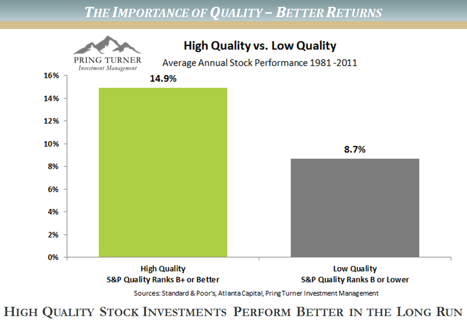 As a conservative investment management firm, we have always built many layers of risk protection into portfolios, including the key components of quality, value and income. High quality companies consistently grow their earnings regardless of the underlying business atmosphere. The so-called “cream of the crop” have key competitive advantages that allow them to prosper in the long run.  Standard and Poor’s (S&P) has published quality rankings on stocks over many decades. These rankings are based on the company’s most recent 10 years of earnings and dividend data and range from A+ (highest) through D (Lowest).  History shows that high quality stocks (ranked B+ or better) generate better returns over the long run. In this long term S&P study, high quality stocks earned average annual returns of 14.9%, significantly outperforming its low quality counterparts (ranked B or lower) at 8.7%.