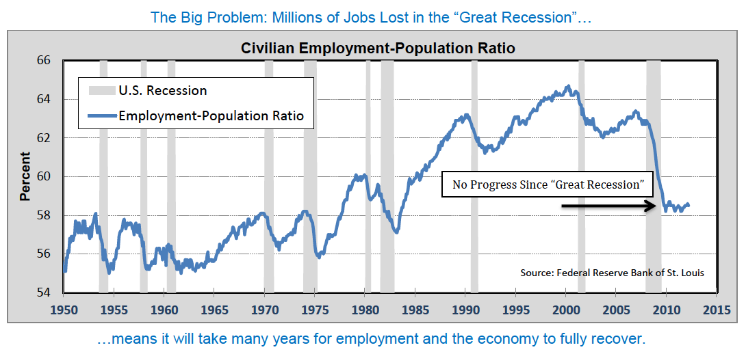 Recent monthly employment statistics reflect historically weak job growth for this nearly three year old economic expansion. Relatively weak job growth is only part of the bigger problem. Millions of jobs were lost during the 2007-2009 ‘Great Recession’ that have not been recovered and will take years to mend. The Civilian Employment to Population Ratio (number of working Americans/ total eligible workforce) demonstrates the extent of the bigger problem.