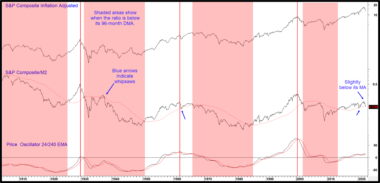 The S&P/M2 ratio is edging below its 96-month Displaced MA, a secular warning!