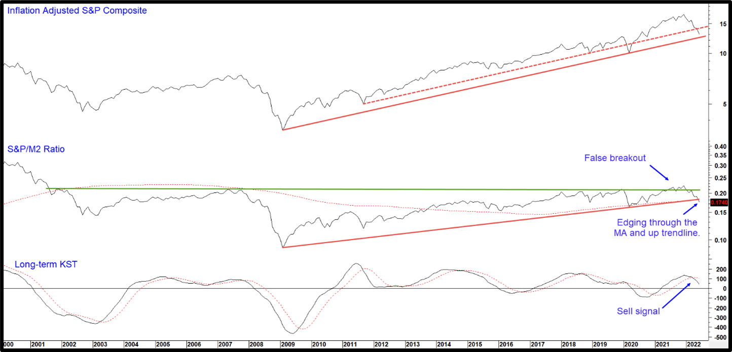 Chart 6 takes this a step further by focusing on the post 2000 period. There are a couple of points to make. First, the ratio experienced a probable false upside break from a massive accumulation pattern. The break is extremely close to being confirmed, which would happen with a decisive drop below the 2009- 2022 up trendline and displaced 96-month MA. Since the long-term KST is in a bearish mode, the odds of a downside break are enhanced. Equally as important, the deflated S&P is just a whisker above its 2009-2022 secular up trendline.
