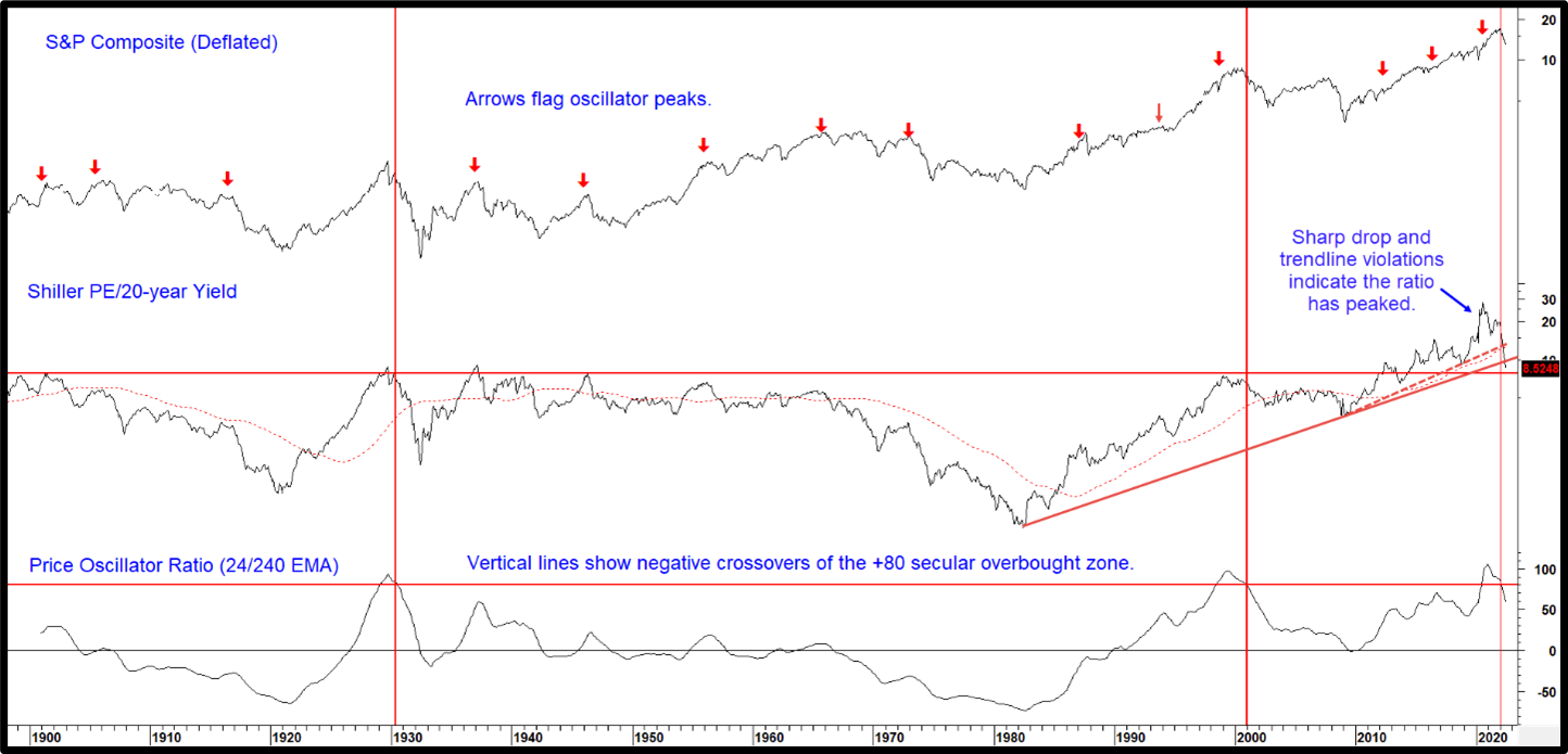 All secular bear markets are characterized with a long-term (10- to 20-year) decline in inflation adjusted stocks. These pervasive negative trends are almost always caused by elevated price inflation, but parts can also be characterized by excessive deflation, as in 1921, 1929 – 1932 and more recently the late 2008 early 2009 part of the financial crisis. These unusual swings in inflationary and deflationary forces reflect longer-term structural problems, which is why secular price movements typically extend between 10 to 25 years. This point can be appreciated by observing the plethora of recessions that develop during the (shaded) secular bearish periods in Chart 1 and their paucity post 1900 in the unshaded secular bulls. Even those recessions that develop under the context of a secular bull are generally mild; 1960 and 1990, or brief, as in 2020. Because of the length of these very long-term price movements, it’s usually only possible to spot reversals several years after the final turning point. Citing a reversal within 5 months of a possible (January 2022) high with any degree of certainty, is therefore pushing the envelope somewhat. Another difficulty arises from the paucity of data points.