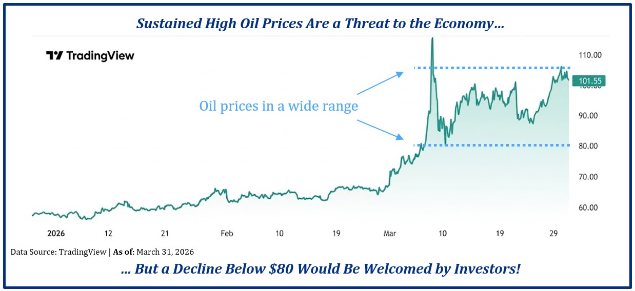 Right now, the market’s focus is squarely on oil. As the conflict began, oil prices briefly spiked toward $120 per barrel on fears of supply disruption through the Strait of Hormuz. Since then, prices have eased back into a volatile range roughly between $80–$105. Stocks have been reacting accordingly — rallying when oil pulls back and struggling when it moves higher. For the moment, that relationship is driving day-to-day stock market behavior.