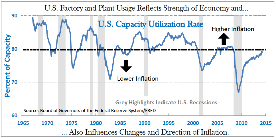 Adding to recent CPI data is an important economic indicator, the US Capacity Utilization Rate. Capacity utilization is simply the percentage of factory usage. This measure typically alerts to changes in direction of inflation. The most recent reading at the end of May 2014 is 79.1—meaning plants are running at close to 80% of capacity. That’s a far cry from the dismal readings coming out of the last recession when only 65% of our nation’s plant capacity was operating! Historically, readings approaching 80 in this indicator argue that inflationary pressures will begin to build as we use up idle capacity and the economy continues growing.