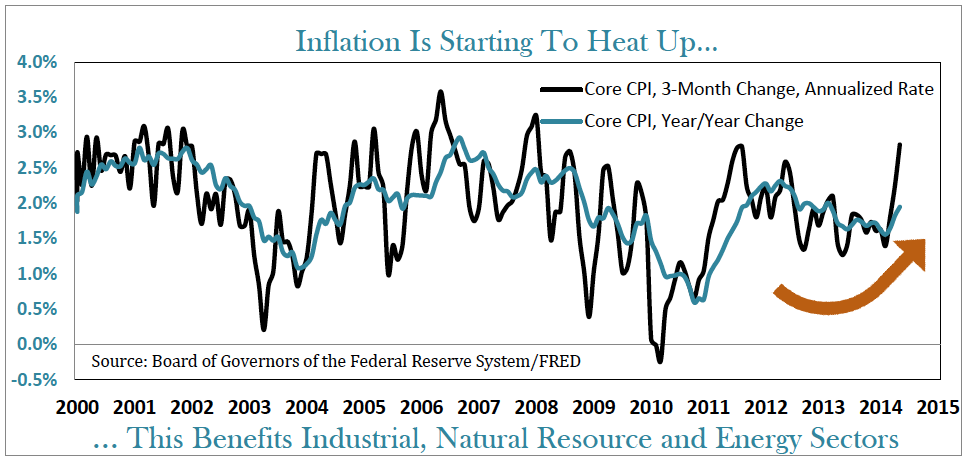 Pring Turner clients enjoyed strong returns in the 2nd quarter and once again reached all-time highs in wealth (adjusting for deposits and withdrawals). That makes new highs for portfolios in 13 of the last 15 very challenging years. Grateful for the market strength we are also mindful of typical market behavior in the later stages of the business cycle. Late in the cycle, inflation begins to accelerate and our portfolio tactics gradually adjust to these changes. We are prepared to both navigate the challenges and take advantage of the opportunities in the second half of 2014.