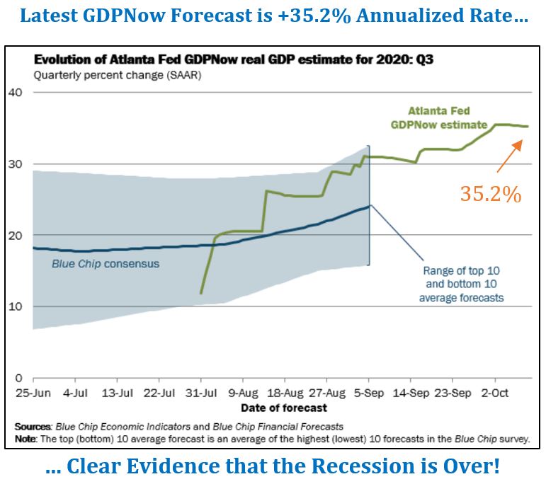 Yes, the sharp recession that began abruptly with an unprecedented partial economic shutdown has very likely ended almost as quickly as it arrived. Case in point: the latest GDPNow forecast, by the Federal Reserve Bank of Atlanta, is estimating a remarkable 35.2% annualized growth rate for the 3rd quarter! A new economic expansion has begun, but we have a long way to go to get back to the pre-pandemic record high employment numbers and broad-based growth we all enjoyed. More jobs will return as each State gradually reopens for business and a long-lasting expansion can take hold. Another encouraging sign is the rapid improvement in a multitude of leading economic indicators including new orders, retail sales, housing permits and the stock market itself. Lastly, the U.S. is not the only country showing economic improvement—in fact, a global industrial advance is underway. Altogether, these favorable points bode well for continued growth (no matter who wins the election) as we look forward to 2021!