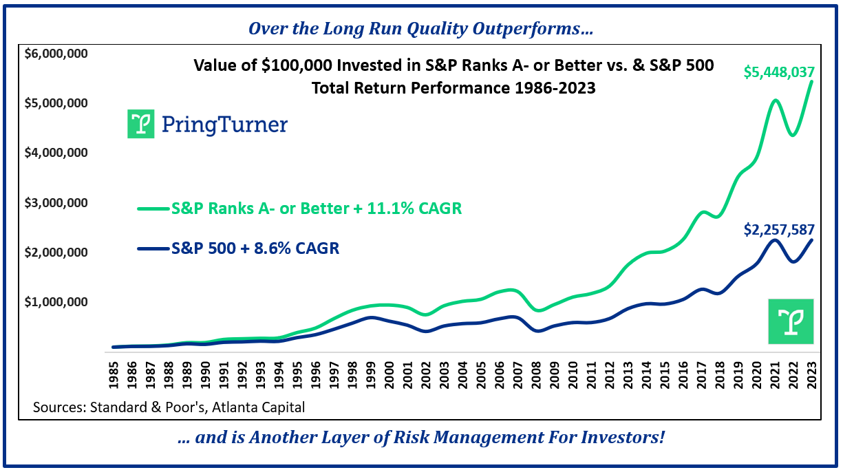 Let’s demonstrate how quality stacks up against the average stock. Between 1986 and 2023, S&P found that the highest quality stocks (those with S&P ranks A- or better) showed off an impressive 11.1% compound annual growth rate (CAGR). In comparison, the S&P 500 index, containing the wide spectrum of both higher and lower quality rankings, posted an 8.6% growth rate.