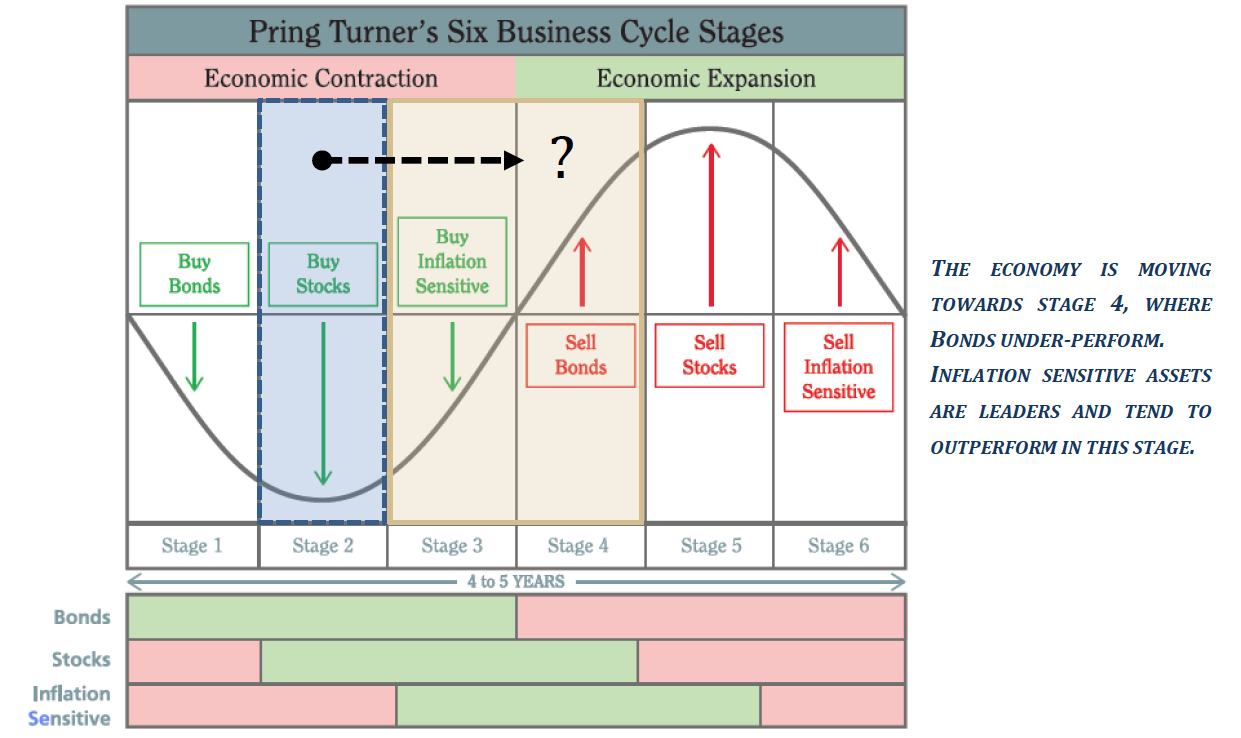 The business cycle is advancing in its sequential progress and that has implications for portfolios. Our barometers, developed to identify the business cycle stage, currently place us in Stage 2, which is generally a favorable environment for bonds and stocks but not a good one for inflation-sensitive assets (commodities and natural resource sectors). It has been a Stage 2 environment since March 2012. However a change appears close at hand. Indicators within the barometers are showing an underlying transition is underway that will advance the business cycle to Stage 3 or possibly even 4. A stage shift signals important portfolio allocation changes and stock sector decisions. In simple terms it means we are moving toward a more inflationary direction in the markets—that implies a tougher backdrop for high quality bonds and new leadership opportunities from natural resource sectors. Historically, late cycle (Stage 3, 4) leaders include many raw material and resource sectors including metal, mining, energy, chemicals, and industrials. As the business cycle progresses portfolios will be systematically re-shaped to adapt to the changing environment.