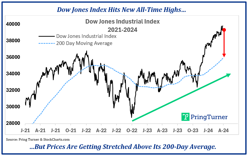 While the major stock market indexes, like the Dow Jones Industrial average displayed in the chart, are hitting new all-time highs, they are getting quite stretched above their 200-day moving average. The Dow Jones index average price over the last 200 days is represented as the smooth blue line on the chart. The current price of the index is significantly higher than the average price, which signals that a temporary market pullback is possible. In our view, recent readings of investor sentiment and psychology point to an excessive amount of greed: another good reason to tread more cautiously.