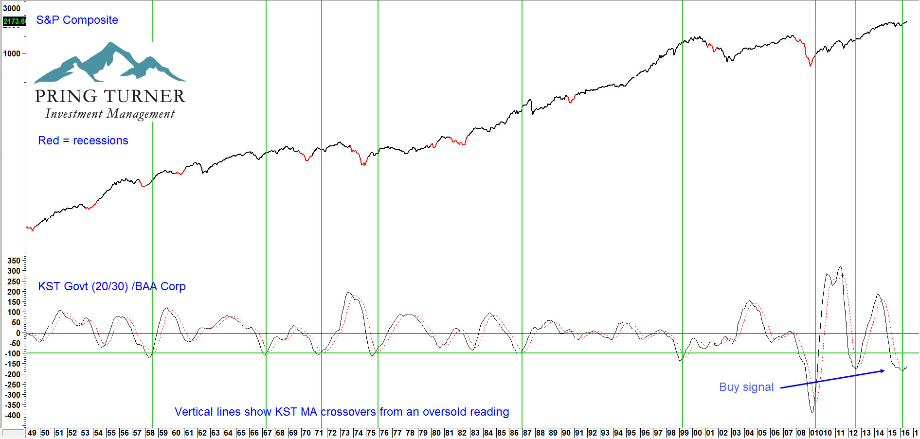 A strong rally in stocks is often associated with an improvement in bond market confidence. One way that this is telegraphed is from reversals in momentum calculated by the ratio between low quality and high quality bonds (government yields/ corporate Baa yields), a so called “credit spread”. This relationship is shown in long-term momentum format in Chart 4. A rising indicator reflects improving confidence amongst bond investors, as they favor higher yielding but more risky Baa corporate bonds over government bonds. The vertical lines tell us that a bottoming in momentum at or below the green “confidence” line indicates that a more positive trend sentiment has begun. In all, there have been eight signals since 1949. In each situation, equities rallied with only the duration and magnitude open to question.