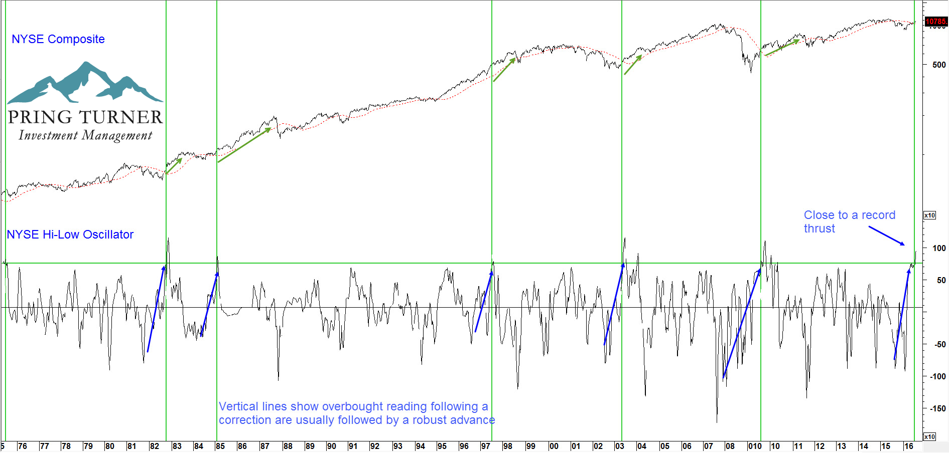 Chart 5 expresses market breadth in the form of the momentum of stocks registering net new 52-week highs on the NYSE. The vertical green lines flag when this price oscillator, following a corrective period (blue arrows), moves above the overstretched green horizontal line. This action suggests the market is severely overbought; however, unlike most overstretched conditions, this is positive because it usually reflects a bull move in its initial stages. The chart shows that each of these six instances has been followed by a worthwhile advance since the 1970’s.