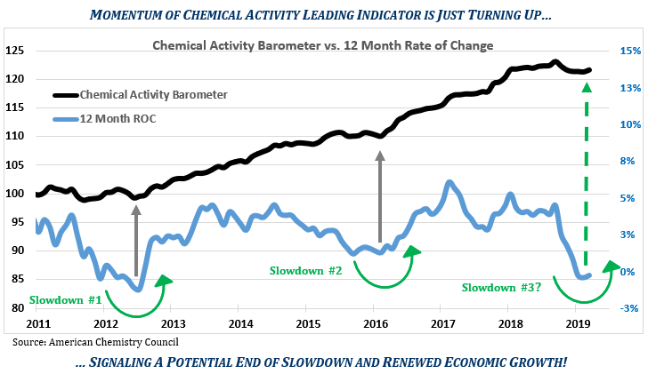 In the early weeks of 2019, the economic outlook was uncertain. However, the pace of economic growth was slowing down. The key unanswered question was: would this slowdown lead to an all-out recession? This is important for investors, since an actual recession has severe repercussions for the stock market versus only a slowdown. Just as the seasons are transitioning from winter to spring, we see evidence of “green shoots” or early signs of renewed economic growth and further extension of this nearly 10 year old business cycle. For example, one leading economic indicator that we follow is the Chemical Activity Barometer with its momentum featured in the bottom half of the chart. This dependable indicator is showing early signs of turning up once again, indicating perhaps the third mid-cycle slowdown since 2009 is behind us and stronger economic growth is likely.