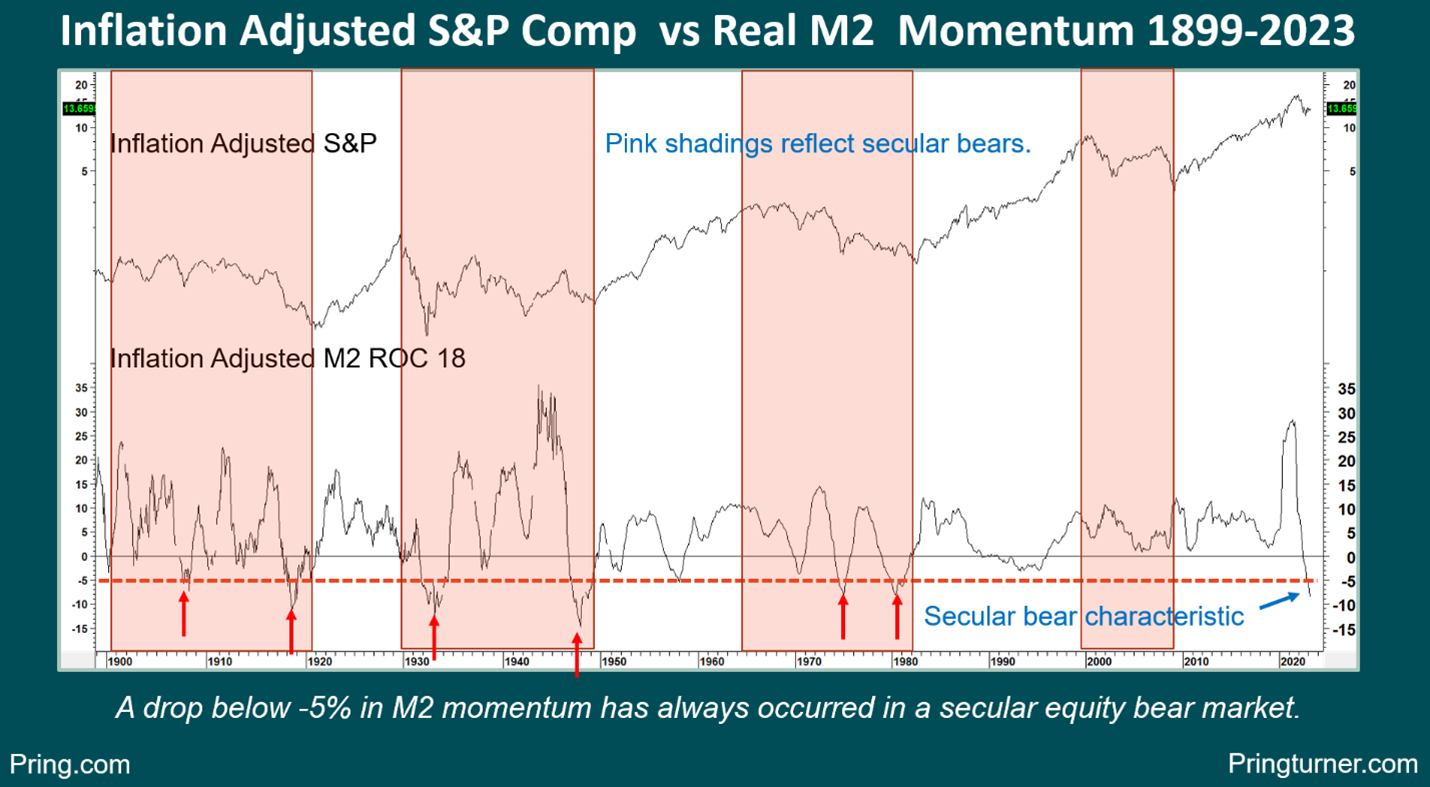 Secular trends in inflation adjusted equities average between 15 and 20 years. Since such price movements embrace a number of business cycles, identification of a reversal usually requires several years. If 2022 was the zenith of the post financial crisis bull market, the intervening year and a quarter is a relatively short period from which to conclude that a turn in the secular tide has taken place.