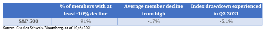 Whew! That is a long list of worries for an investor to digest.  Understandably, these headwinds provide an excuse for stock prices to take a breather.  This quarter, the S&P 500 (an index made up of the 500 largest U.S. companies) endured a relatively mild 5% decline thanks to strength in a few ultra-large technology stocks; however, the damage is more severe under the surface. In fact, more than 450 of the stocks in the index experienced a 10% or greater decline at some point during this year. Moreover, the average stock decline from their highs is -17%!