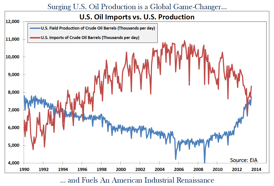 In addition to being favored in this part of the cycle, these sectors have strong long term fundamentals in their favor as well. We would like to elaborate on one very encouraging, game-changing, global economic event—namely America’s drive toward energy independence. A significant event will transpire this month or next and will have implications for the global economy far beyond most investors’ comprehension. America will flex its energy muscle very soon when domestic oil production exceeds imported oil – for the first time since the early 1990s! Consider U.S. natural gas and crude oil production peaked in the early 1970s and slowly declined until about 2006. In the past half dozen years domestic production, thanks to revolutionary technology taming ‘unconventional’ fields, has surged dramatically, completely reversing a nearly 40 year decline in U.S oil and gas output.